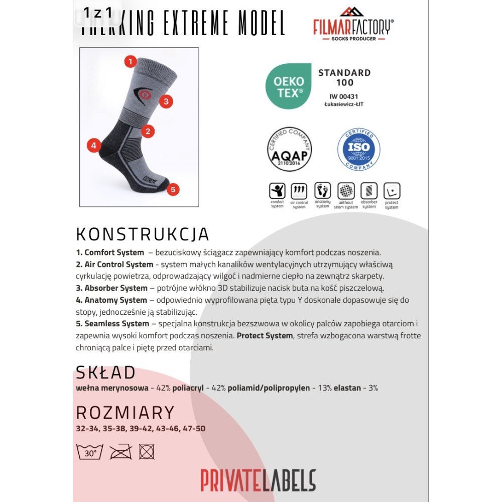 Grube skarpety do zimowego trekkingu, wykonane z najlepszej jakości materiałów. Nadają się na wędrówki w najcięższych warunkach.